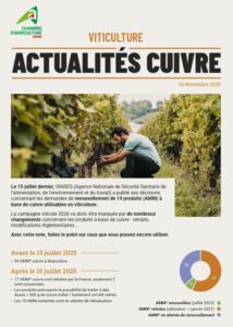 Le 15 juillet dernier, l’ANSES (Agence Nationale de Sécurité Sanitaire de l’alimentation, de l’environnement et du travail) a publié ses décisions concernant les demandes de renouvellement de 19 produits (AMM) à base de cuivre utilisables en viticulture. La campagne viticole 2026 va donc être marquée par de nombreux changements concernant les produits à base de cuivre : retraits, modifications règlementaires…